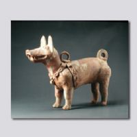 首都博物馆藏。泥质红陶。明器。立姿。口部微张,双目前视,双耳耸立,颈与胸之间有系带,并连接着链环,尾巴上卷,四肢直立有力,肌体壮硕,栩栩如生。