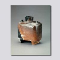 首都博物馆藏。明器。直口,平肩,肩部两侧各有一个桥形系,长方形直腹,平底,底部有两个倒梯形长直足。通体施低温褐色釉,釉色不匀。