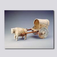 首都博物馆藏。泥质红陶。明器。车为双辕(已失),舆箱呈矩形,前面敞开,后面右侧设一门,左右两面全封闭,上连卷棚式车盖,前后檐均较短,尤其是前檐较短是早期牛车的特征。舆箱底部有4个小孔用以固定车轴。车轮为模制,片状,外侧用双线刻辐条。每轮辐条共16根,集中于粗圆的车毂上。车毂硕大也是当时车辆的特征之一:古代车轴与车身相固定,行车时轮与毂转动,毂上承车厢,下纳辐条,还要耐得与车轴摩擦,故而体积较大。牛伫立于车前,作驾车状,埋首引颈,肩峰高起,体态雄健,有将欲发车之势,十分形象生动。此牛车塑造写实,比例中规。牛车模型明器多见于南北朝时期的墓葬中。