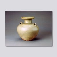 首都博物馆藏。盘口,束颈,溜肩,鼓腹下收,平底内凹,肩两侧附条形耳,耳上有刻划线纹,肩部两道弦纹之间印带状网格纹。整器施青釉,施釉不及底。胎体呈灰色,胎质细密,釉面温润。