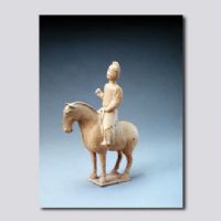首都博物馆藏。明器。男俑与马俑为分别模制后再捏合一体,男俑头戴幞头,身着右衽窄袖圆领长袍骑于马上,足蹬长靴,左手扶鞍桥,右手执物(已失)。马立于长方形扁平托板上,鞍鞯俱全,神态驯顺。通体施黄釉,釉面有细碎开片。