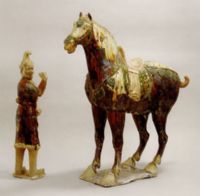说 明: 马俑施棕红、绿、白三彩釉,是一匹骏马形象.俑人施棕红、白彩釉。