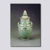 首都博物馆藏。直口,粗颈,肩部呈阶梯状,饰向上五管,收腹,圈足,宝刹式盖。通体施青釉,釉面青翠,有大开片,釉层清澈,胎体厚重。