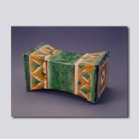首都博物馆藏。泥质红陶,有化妆土。长方形,束腰。以黄、绿、白三彩装饰,每面中心部位都有行书题诗一首,两侧为边饰。在瓷器上题写通俗诗句和民谚作装饰是磁州窑的一大特点,它反应了商人、小市民的思想意识。