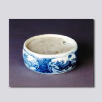 首都博物馆藏。鼓式,圆唇,腹微鼓,腹部饰青花开光海兽纹。底书青花双圈“大明崇祯年制”6字双行楷款。青花颜色较深。造型新颖而又不失古朴,为别具一格的文房用品。