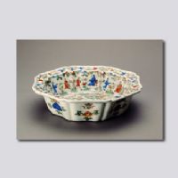 首都博物馆藏。窝角八棱形,宽板沿,浅腹,砂底。口沿部绘“王羲之爱鹅”与“林和靖爱鹤”图案,间隔排列。内壁及盆内底均绘“王羲之爱鹅”故事图案,共有13组。外壁绘花托八宝纹,通体以红、绿、黄、紫、褐诸彩,彩色艳丽,构图饱满。外底书青花双圈“大明万历年制”六字双行楷书款。布局繁密是万历时期瓷器的特征。