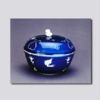 首都博物馆藏。敞口,深腹,圈足,狮钮盖,狮钮上无釉。通体施蓝釉,上有白色花纹,盖面装饰绣球纹,与狮钮共同组成狮子戏绣球图案。碗外壁装饰海浪鱼跃。其做法是先在胎体上堆出花纹,刻划形状,然后在没有花纹的地方施蓝釉,形成蓝釉白花。