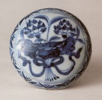 说 明: 盒釉色白泛青,青花釉色浓艳。盒呈扁圆形。