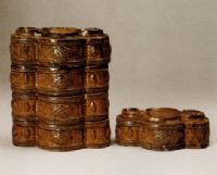 说 明: 除盒底外通体施釉,胎质灰白松软,釉薄光亮有细小开片.