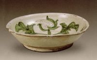 说 明: 红色陶胎,上白色化妆土,施牙白色低温铅釉。纹饰粗狂豪放,清新爽洁。