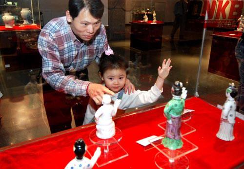 一位父亲正给小女儿介绍精美的陶瓷人物雕塑。