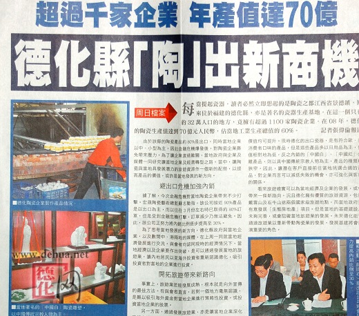 据了解,今次金融危机对当地陶瓷企业带来不少打击。宏晟陶瓷艺术总监苏志勤指,该公司接近90%产品是以出口为主,而以往在3月份左右时已取得约80%订单,但是受到金融危机打击,订单减少乃无法避免。因此,该公司正努力将内销比例逐步提高至30%。为了思考当地发展的新方向,德化县政府与当地企业,以及数间中、港两地的媒体,在上周一同就当地经济发展进行交流。与会者均认同现时的经济情况下,当地经济以及企业要作出突破,是可以通过发展当地的旅游业,让内地居民以至海外投资者重新认识德化,吸引投资者对当地的企业进行投资。