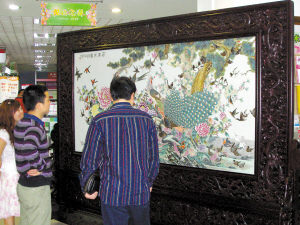 昨日,很多逛解放碑新华书店的市民,都被其五楼的巨幅陶瓷屏风所吸引。据该陶瓷屏风销售商——景德名瓷店负责人肖建平总经理称,这个迄今为止世界上最大的陶瓷屏风,宽3.3米,高2.4米,比目前陈列在人民大会堂的报春图瓷板屏风还要宽出20厘米。