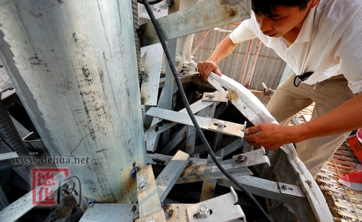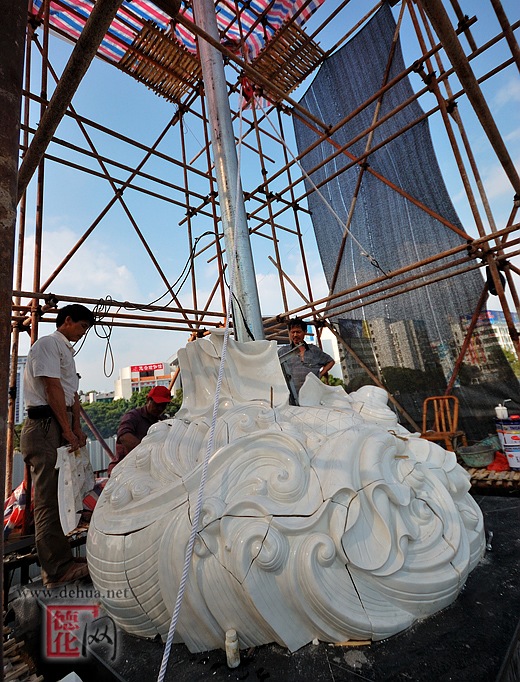 图为瓷都广场主题雕塑——巨型陶瓷“渡海观音”已经开始安装调试