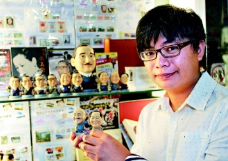 什么商品最受陆客欢迎?吴松洲指着玻璃柜里一排“政坛明星公仔”,包括抱黑猫白猫的邓小平、手拿十大建设蓝图的小蒋,还有马英九、萧万长等,笑说这是店里的“招财猫”,许多陆客一买就是二十几个。