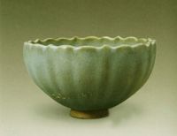 碗敛口,深鼓腹,圈足较小。作八瓣形莲花口,腹壁内外均凸现与之相对应的莲瓣棱。施釉天青色,釉质匀净温润,且伴有开片纹。器口及莲瓣棱处釉薄呈黄色,流釉使壁底部出现垂釉,足部露灰白胎,质地致密。制作工艺尤为精湛,其整体造型端庄而典雅,似怒放中的莲朵生机勃发。这种宽肥的莲花纹装饰风格,与北魏时期云冈石窟佛教艺术中的莲花纹装饰一脉相承,极具鲜明的时代性和地方特色。
