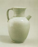 高颈,喇叭口,口沿外侈,卵形眉腹,饼状底,肩部前置管状短流,后置双圆条鋬手,与口沿相联系,造型典雅、简洁。器体内外满施白釉,底部露胎,釉色匀润,白中闪青,胎骨细腻坚致,为河北邢窑晚唐时期的优质产品。