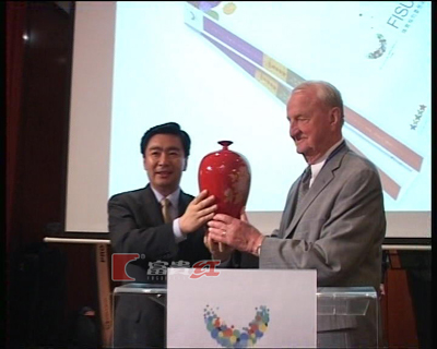 7月11日,在贝尔格莱德举行的“深圳之夜”晚宴上,嘉宾云集,王荣市长郑重地向乔治·基里昂赠送了由福建省富贵红文化发展有限公司制作的高温红釉瓷珍品《新梅瓶》。