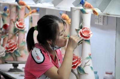 在景德镇法蓝瓷实业有限公司,一名女工在为素胚上彩绘