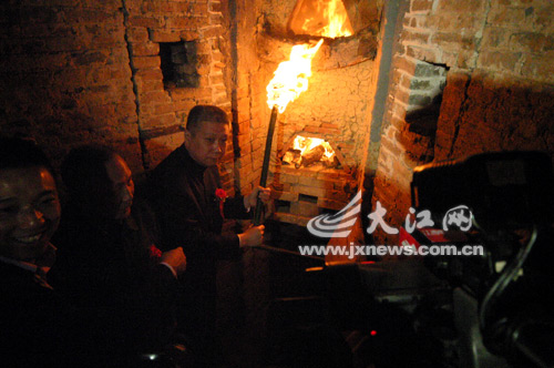 收藏家马未都先生(持火把者)出现在镇窑复烧现场。