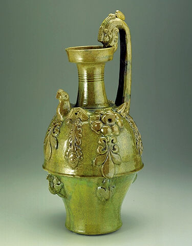 这件出於北 墓中的陶壶不仅罕见,而且装饰精美。它以螭龙为柄,前端塑出鸡首,壶上部贴塑对称的莲花、忍冬等花叶纹饰,壶下部贴塑四支展翅的凤鸟。外观华丽,典雅庄重。新颖的纹饰不仅显示出当时中国北方制陶业的先进水平,还反映出中国与西域各国文化上的联系与交流。