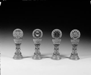 粉彩莲座托八吉祥:大清嘉庆年制,高20.5cm,是佛堂里的供器,品种以景泰蓝为多,像这种粉彩的瓷器十分少见。“八吉祥”指8种佛教法物,即轮、螺、伞、幢、花、罐、鱼、肠。这套瓷塑里的每一件法物都被制成两面对称的镂空雕塑。