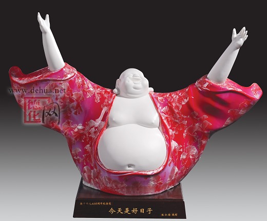 《今天是好日子》新中国甲子华诞庆典珍藏纪念瓷《盛世万莲》系列之一,窑变釉的弥勒,袒胸露腹、笑脸洋溢、舒展双臂、娇艳的偏紫色胭脂红衣,扇花朵朵,灿若烟霞,活灵活现,栩栩如生。