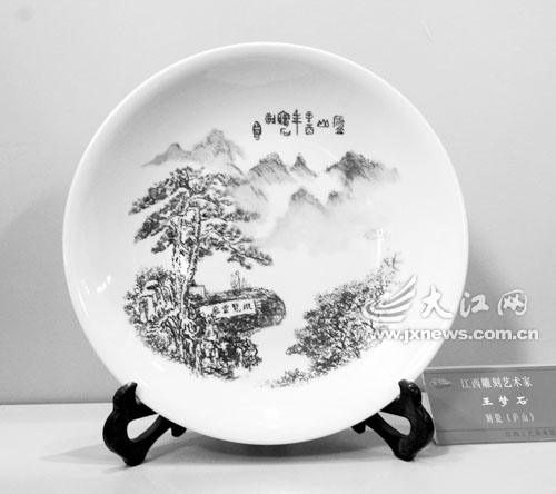 令人欣喜的一个看点是,江西工艺美术馆馆藏的30余件珍贵工艺美术品,也在此次大赛展会整体亮相了一番。其中,印象深刻的有,刘远长的雕塑瓷《楚魂》、“刻瓷大王”王梦石生前所作的《庐山》、熊钢如青花釉下彩绘《菊花》瓷瓶及戴玉梅大师的古彩圆盘《映日荷花》等。尤其值得一提的是王梦石的刻瓷作品。这位江西早年的金石篆刻家,在瓷上作画以一种独特的刻制手法,画面的点和线充满着金石趣味。这件瓷盘作品阴刻着庐山著名景点纵览云飞,其上以篆书题款“庐山辛酉年梦石刻”。江西工艺美术馆馆藏中国工艺美术大师老、中、青几代人的作品数以千计、品种丰富,有驰名世界的景德镇瓷器,风格素雅的南昌乳白瓷雕,惟妙惟肖的瓷板画像,巧夺天工的微雕,光泽古朴的鄱阳、宜春脱胎漆器,绚丽浑厚的江西漆画,宛若象牙的翻簧竹刻等。据现场工作人员彭火林介绍,该馆拿出藏品搬出馆外参展的机会相当罕见,此次积极参与盛会,是为了响应第五届中国(江西)红色旅游博览会的召开,为宣传江西的红色旅游文化助力。能看到该馆珍藏多年的精品,前来的观众看来还是蛮幸运的。