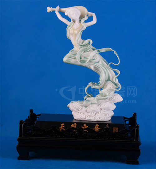 陈列在艺韵瓷庄展厅的瓷塑精品——《天籁之音》就是德化瓷塑精美材质与高难度工艺的一个很好的表现。此作品系由福建省德化县艺韵陶瓷研究所副所长、福建省工艺美术师陈能谟所精心研究创作,以中国白瓷与高温窑变结晶釉相结合,配上飞天优雅的高难度造型,更是把陶瓷的烧制技术推上一个新的台阶,在第五届福建省工艺美术精品“争艳怀”大赛中荣获优秀奖。