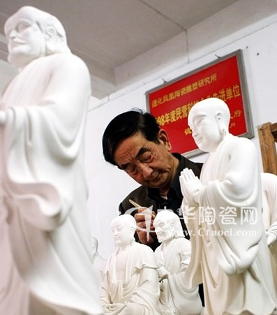“老骥伏枥,志在千里”,年过七旬的他想的不是享清福,而是探究如何突破德化陶瓷没有大型“中国白”瓷雕的现状,将德化陶瓷艺术推向高雅的艺术殿堂。大型成套“中国白”瓷雕《和善十八罗汉》和《夜光五百罗汉》的成功烧制初步达成了他的心愿,是他的一大手笔。它们的成功烧制引起了社会各界的强烈反响,作品特邀参加在江苏无锡梵宫举行的第二届世界佛教论坛大会暨中国工艺美术大师佛教艺术珍品展,并被永久收藏、展示。