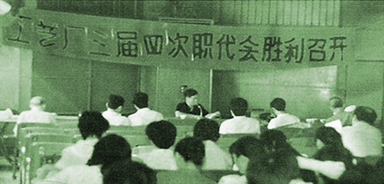 八十年代,工艺厂时期的职代会上,虽然环境很简陋,但影响不了工人们如饥似渴的学习精神。