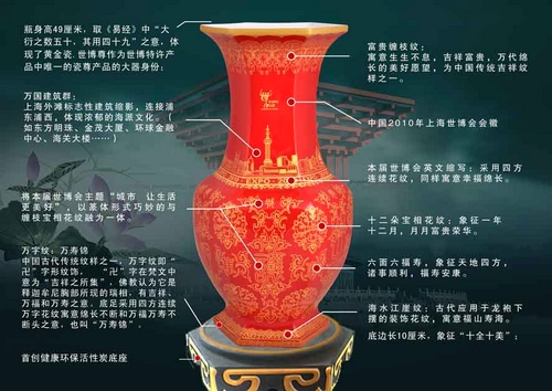 世博尊为六棱造型,代表东南西北天地的“六和”,寓指“四宇呈瑞,天地祥和”;瓶高49厘米,取《易经》 “大衍之数五十,其用四十九”之意,体现了“黄金瓷。世博尊”作为世博特许产品中唯一瓷尊产品的大器身份;底足边长10厘米,象征“十全十美”,中国红尊身,上腾金彩珐琅,彰显皇室尊贵;瓶身六面12朵宝相花,象征一年12个月,月月富贵荣华;宝相缠枝纹中,篆体字上海世博会主题“城市,让生活更美好”于尊腹处华丽绽放,寓意生生不息、鸿福和祥;尊棱处六个“寿”字与缠枝纹融为一体,将“福寿无疆”的寓意升级;尊颈处为外滩万国建筑群和以东方明珠为标志的黄浦江畔,新老建筑相合,见证上海一个多世纪的历史变迁,突出了上海世博会“融合”、“创新”的主题;上海世博会会徽及英文缩写“EXPO 2010”环颈一周,突出产品的主题与官方身份;尊口处的富贵缠枝纹路让世博尊的整体美感得以提升;尊足处的海水江崖纹寓意福山寿海,与尊底象征绵延不绝的万字吉祥纹路相得益彰,突出了世博会不断超越、造福于民的宏旨。