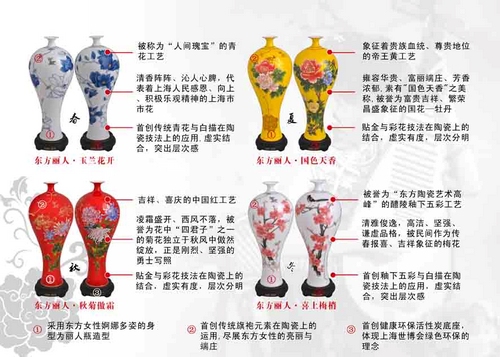 东方丽人系列产品,以丽人瓶为载体,以中国旗袍为设计元素,融合中国陶瓷四大经典工艺(青花、釉下五彩、中国红、帝王黄),将古代四大美女与四种名花、四个季节浓缩其中,和谐呈现,尽展东方女性的靓丽与端庄。