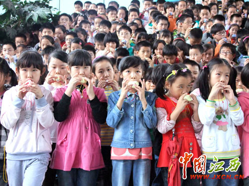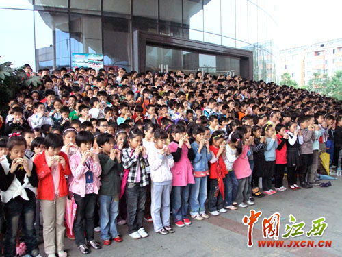 景德镇第一小学的800名小学生在此吹响手中的瓷笛。