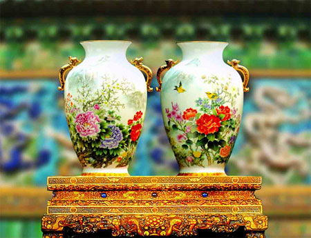 重工粉彩历经时光更替,岁月变迁,如今再次牢牢奠定在世界瓷都的崇高地位。这与经历风风雨雨的中国改革开放30年取得的卓越成就相互辉映。它雍荣华贵的王者之气,正是景德镇对伟大祖国60年华诞的至高献礼。祝福伟大祖国龙凤呈祥,祈福国人富贵平安。