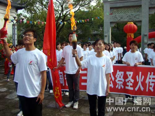 一名老窑工在两名窑工的陪伴下走进佑陶灵祠内采集火种,之后将火种交与景德镇副市长卢正大点燃了圣火。圣火火炬被再次分成几把交与圣火队开始了从御窑场到中国瓷园“瓷业三圣“公祭仪式的接力长跑。景德镇沿途圣火接力队所经之处受到了市民们的热烈欢迎。