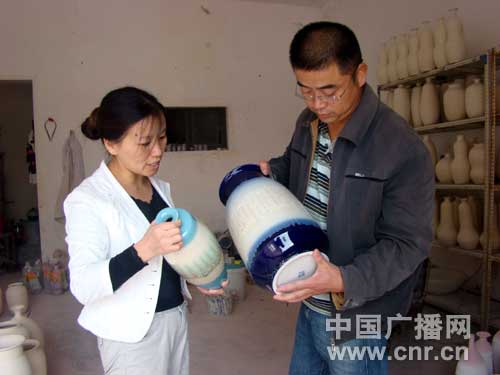 为了进一步了解陈新初这对夫妇两年多来对自己刻意经营的陶瓷产品的发展,10月20日上午,记者如约来到了他们的工作间。陈新初、黄国珍夫妇也较为详细地跟记者说起了他们自己的故事。陈新初向记者说:几年前他们夫妇都是景德镇国营陶瓷厂的下岗职工,然而,下岗后经过一番挫折和努力终于又干起了老本行。但即使干老本行也是逐渐在摸索中一步一步走过来的,其中的酸甜苦辣都也都尝试过了,就像众多的景德镇下岗职工一样,最终靠着自己的追求和努力,干出了自己的一番小天地。