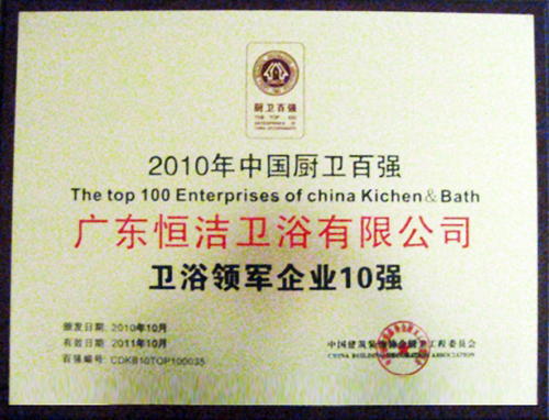 恒洁卫浴入选“2010年中国厨卫百强企业” 一方面表明恒洁卫浴的行业地位得到了行业内部和消费者的充分肯定,另一方面也是恒洁卫浴多年来孜孜不倦、严格要求的品质见证。
