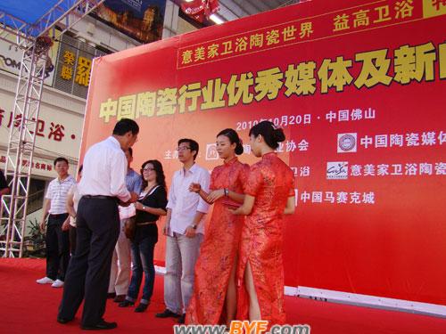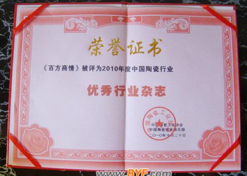 10月20日上午,由中国陶瓷工业协会和中国陶瓷媒体俱乐部联合主办的2010年度中国陶瓷行业优秀媒体及精英表彰大会在佛山市意美家卫浴陶瓷世界中心广场隆重举行。中国陶瓷工业协会理事长何天雄,副理事长傅维杰,副秘书长侯文全,中国陶瓷工业协会马赛克专业委员会会长黄芯红,佛山市文联副主席杨凡周等领导出席了会议。由浙江百方网科技有限公司精心运营的《百方商情》刊物获得了中国陶瓷行业“优秀行业杂志”称号。