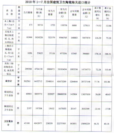 2010年1—7月全国建筑卫生陶瓷海关进口统计