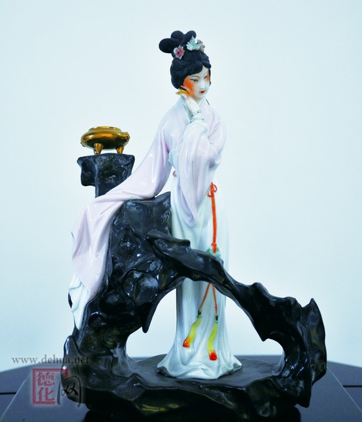 当代著名雕塑艺术家、工艺美术大师王则坚抓住了一听倾心定终生这一爱情故事最精彩的瞬间,创作出瓷塑作品《文君听琴》,把卓文君那一见钟情的澎湃心潮恰到好处地表现出来。你看,文君发髻簪花,左手轻抬,半掩着娇羞、微红的面颊,右手长袖拂地,仔细倾听着那支《凤求凰》的曲子,面部表情沉静,似凝神倾听,又好像略有所思,整个氛围极其沉静,人们却能从她的神态中,看到她内心一见钟情、一听倾心的感觉在涌动,看到她那被琴声激起的澎湃心潮,把一个千年的爱情故事塑造得生动形象,呼之欲出。