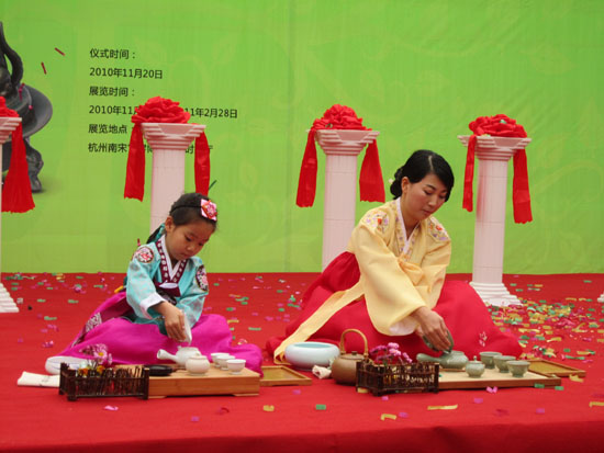 康津文化院金奎植院长、杭州南宋官窑博物馆邓禾颖馆长先后致辞,表达了建立友好关系的目的和重要意义,并在掌声中签署了协议书。之后韩方嘉宾崔汉善、李龙熙、金圭植,中方嘉宾王宏伟、徐璧和、邓禾颖共同为“千年之情——韩国高丽青瓷大师作品展”的开展剪彩。最后,来自韩国的茶艺师高恩井小姐还为现场朋友带来了精彩的韩国茶道表演。而表演所用的茶具正是李龙熙大师的作品,希望能通过表演向大家展示融入茶道精神的高丽青瓷的独特魅力。