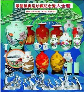 景德镇“奥运瓷”是在北京奥运会期间,经第二十九届奥组委授权,享有世界瓷都美誉的景德镇倾力打造的一套集奥运精神和传统工艺以及当代人文精神于一体的奥运纪念珍藏瓷,包括“奥运纪念瓷”、“奥运饰品瓷”、“奥运日用瓷”、“奥运陈设艺术瓷”、“奥运珍藏纪念瓷”等5大类83个品种162款奥运特许商品。这套产品不仅是景德镇瓷器工艺集大成者,也是首次发行的奥运瓷,并且限量发行,不可再生。奥体瓷业公司总经理王耀说,“产品制作后,我们从模具等各方面,全部毁掉,以后再不可能做出来了,因此具有巨大收藏价值。”