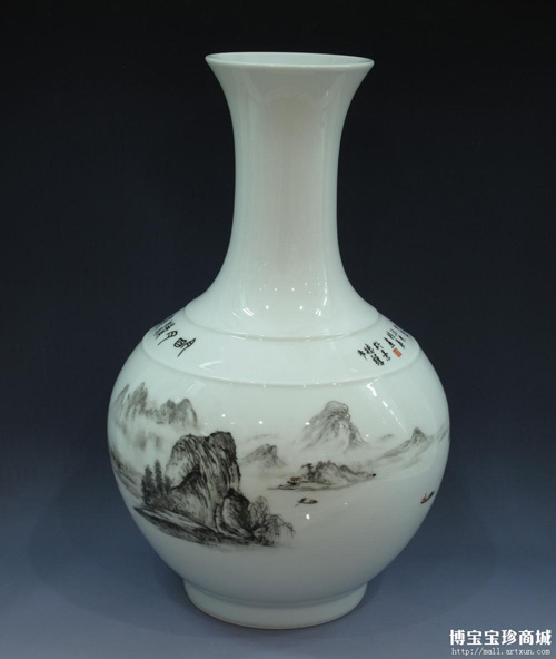 汪桂英女士的陶瓷艺术品,既有父亲的遗风,又有个人特色,广泛采用水画名家名画的画风画技,意境宁静高远,古韵与新意俱佳。图中展示的这件墨彩瓶《唐诗诗意图》便是出自汪桂英女士之手,收藏于博宝宝珍商城,陶瓷造型上极其精巧,新颖独特极富现代美,工笔写意更是意蕴悠长,具有传统水墨的诗性魅力,山水重峦叠嶂,作品具有女性细腻雅致的独特氛围,更是具有极高的收藏价值和审美情趣。