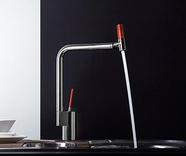 在喷头上增加了红色的元素,让这款龙头看上去更加时尚。为这款简约设计的龙头添加了美观的效果,成为厨房的点睛之笔。