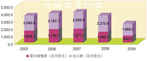 瓷砖出口是西班牙瓷砖销售的主导,出口额一直占瓷砖销售总额一半以上(2009年出口额达16.6亿欧元,占全年销售总额的63.8%)。受世界经济衰退及美国房地产危机影响,2008年以来西班牙瓷砖产量及消费量在世界排行榜上地位均有下降,但瓷砖出口仍保持世界第三。(2009年西班牙瓷砖出口量达2.35亿平方米,占世界出口总量的13.6%)。(见表三、表四)