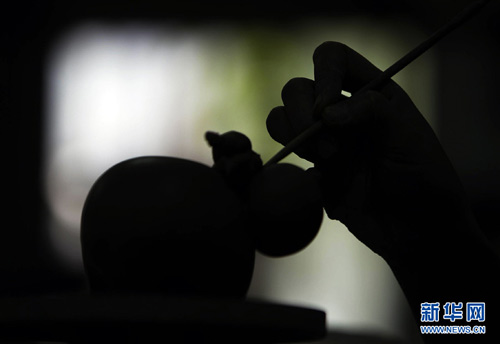 在莺歌镇的一个陶艺工作室里,制陶师傅蔡青峰在给陶坯上釉。
