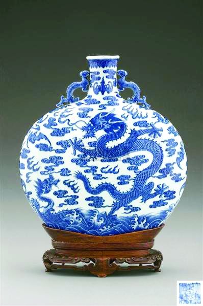 清乾隆青花苍龙教子双螭耳扁壶