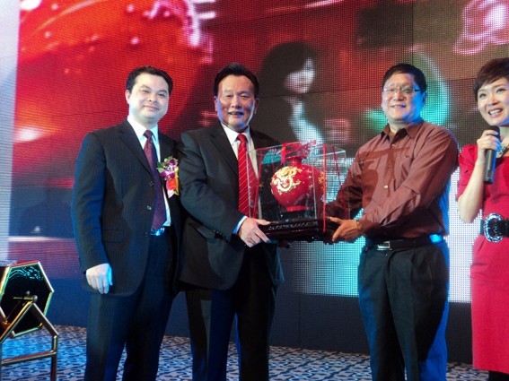 富贵红广东营销中心总经理巫杨金(左)与广东省商业联合会会长巫开立(左二)一起颁发特等奖富贵红《硕果》