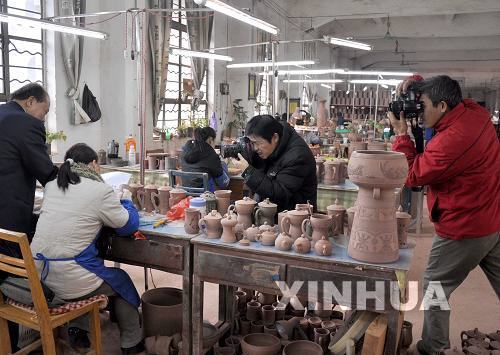 2月16日,新华社摄影记者张爱林(右一)、陈建力(右二)在广西钦州市采访中国陶瓷艺术大师、国家级非物质文化遗产坭兴陶陶艺传承人李人帡。